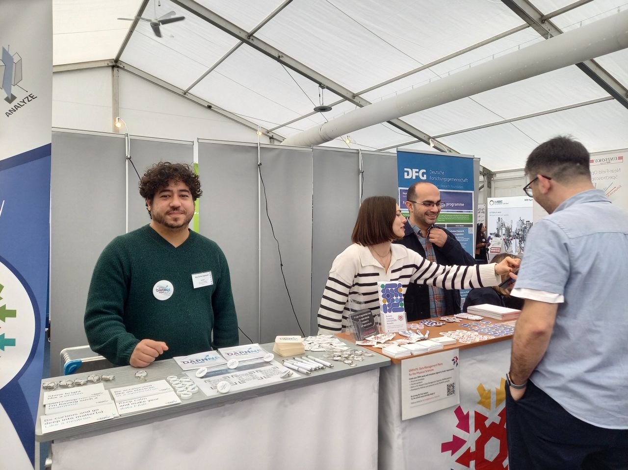 Ein zentrales Highlight der begleitenden Fachausstellung war der gemeinsame Auftritt der NFDI-Konsortien DAPHNE4NFDI und FAIRmat. Während der gesamten Woche führten die Teammitglieder hochkarätige Fachgespräche mit Forschenden, Studierenden und Industriepartnern. Dabei stellten sie die Kernmission von DAPHNE4NFDI vor: Daten von Großforschungseinrichtungen auffindbar, zugänglich, interoperabel und wiederverwendbar (FAIR – findable, accessible, interoperable, reusable) zu machen.